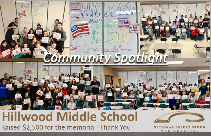 Washington, DC, November 11, 2017 – To celebrate Veterans Day, Hillwood Middle School in Fort Worth, TX, took on National Desert Storm and Desert Shield War Memorial Texas School Challenge! to raise funds to build the National Desert Storm and Desert Shield War Memorial in Washington, DC. On Veterans Day, Eckert and students presented a check for $10,928.55 to Bob Adams, vice president of the NDSWM Board of Directors....